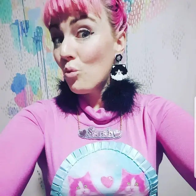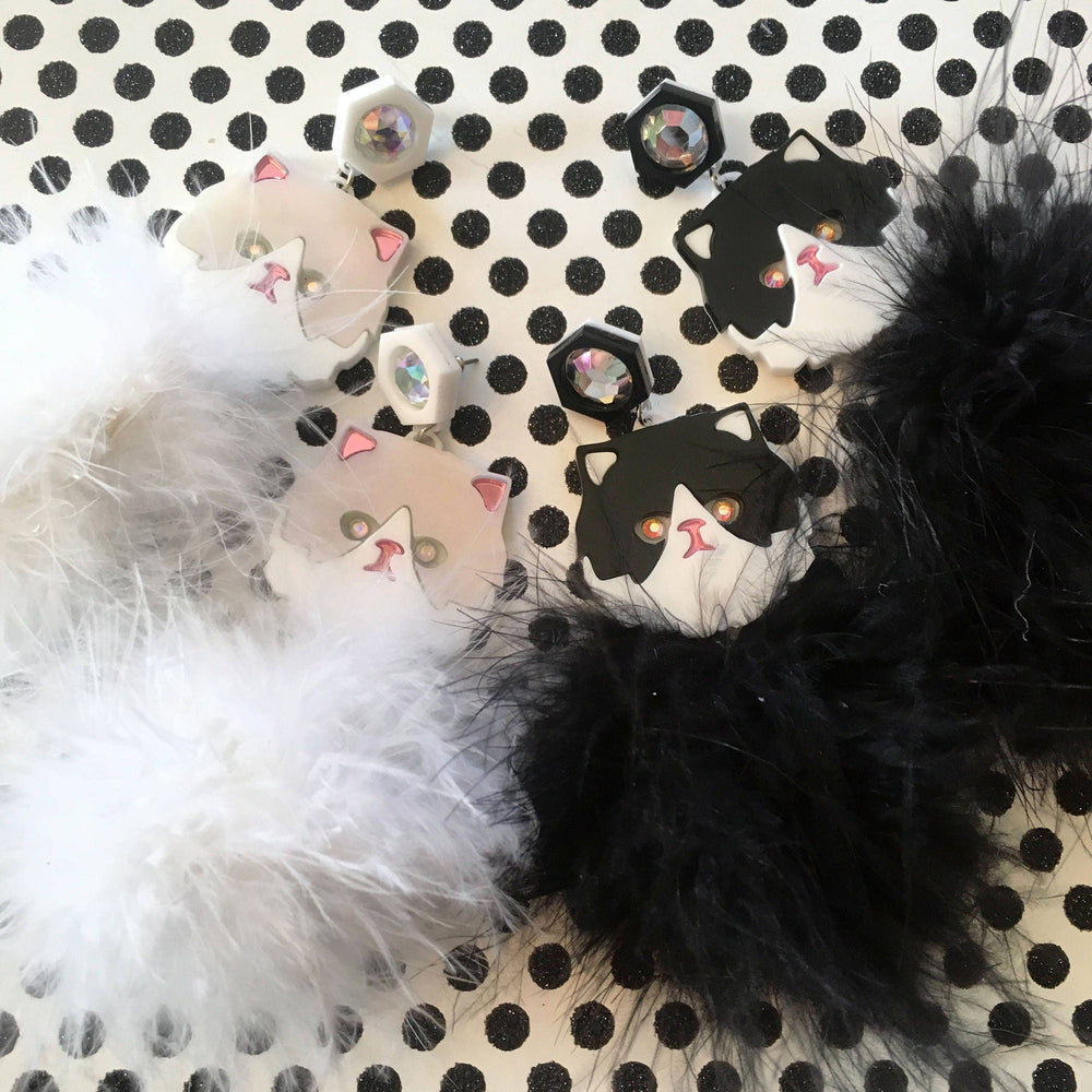 These gorgeous earrings were designed by me & laser cut it from an assortment of 1/8" thick acrylic in white, black pearlescent marbled and mirrored pink mounted onto a thinner 1/16" backing. Please choose between the black and white version, or white version at check out. I hung them from laser cut settings with iridescent rhinestones. Underneath each dangles a large lightweight marabou feather pom pom. The earrings measure about 4" long. They are also available as clip on earrings, or as wrap around hooks for girls with plugs (without the rhinestone stud).